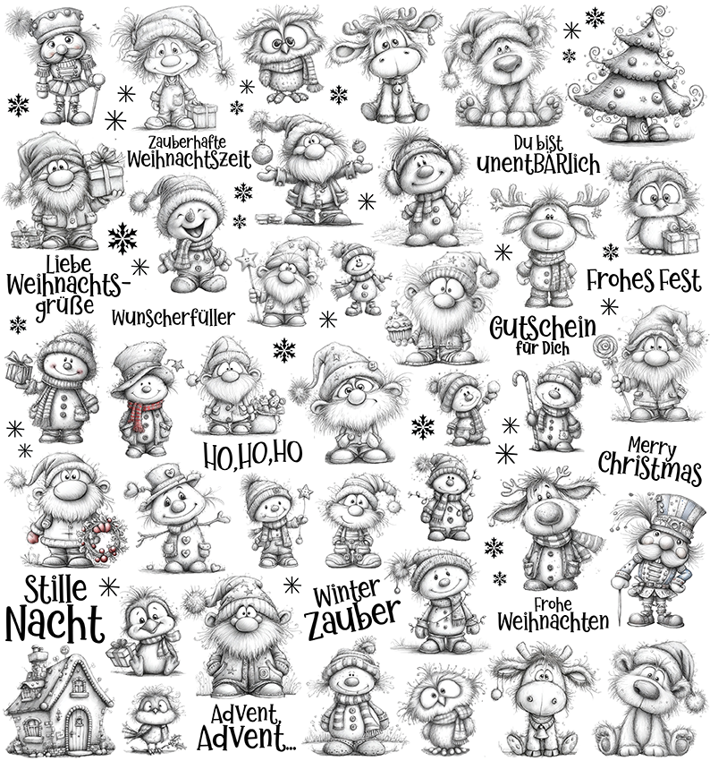 Dieser UV-DTF Stickerbogen Weihnachten überzeugt durch seine liebevoll gezeichneten Schwarz-Weiß-Motive voller Charme und Detail. Ob Weihnachtsmann, Schneemann, Wichtel oder Rentier – jedes Motiv ist fein schattiert und wirkt wie mit Bleistift illustriert. Perfekt für alle, die festliche Designs mit einem modernen, minimalistischen Look kombinieren möchten.